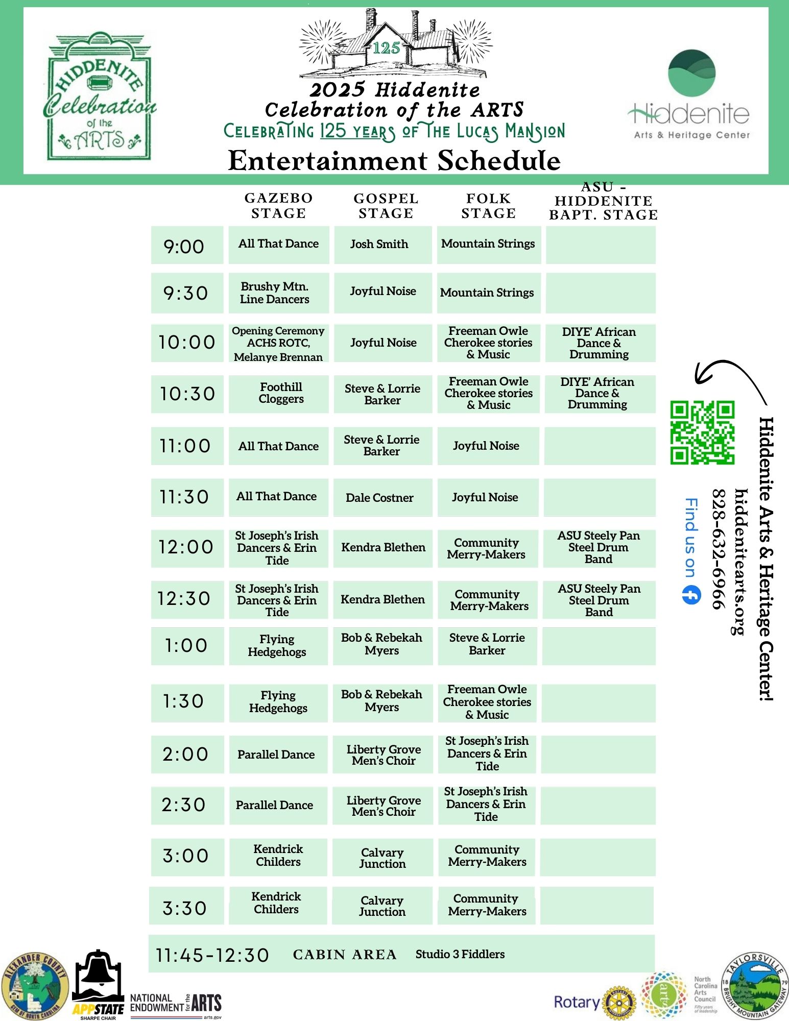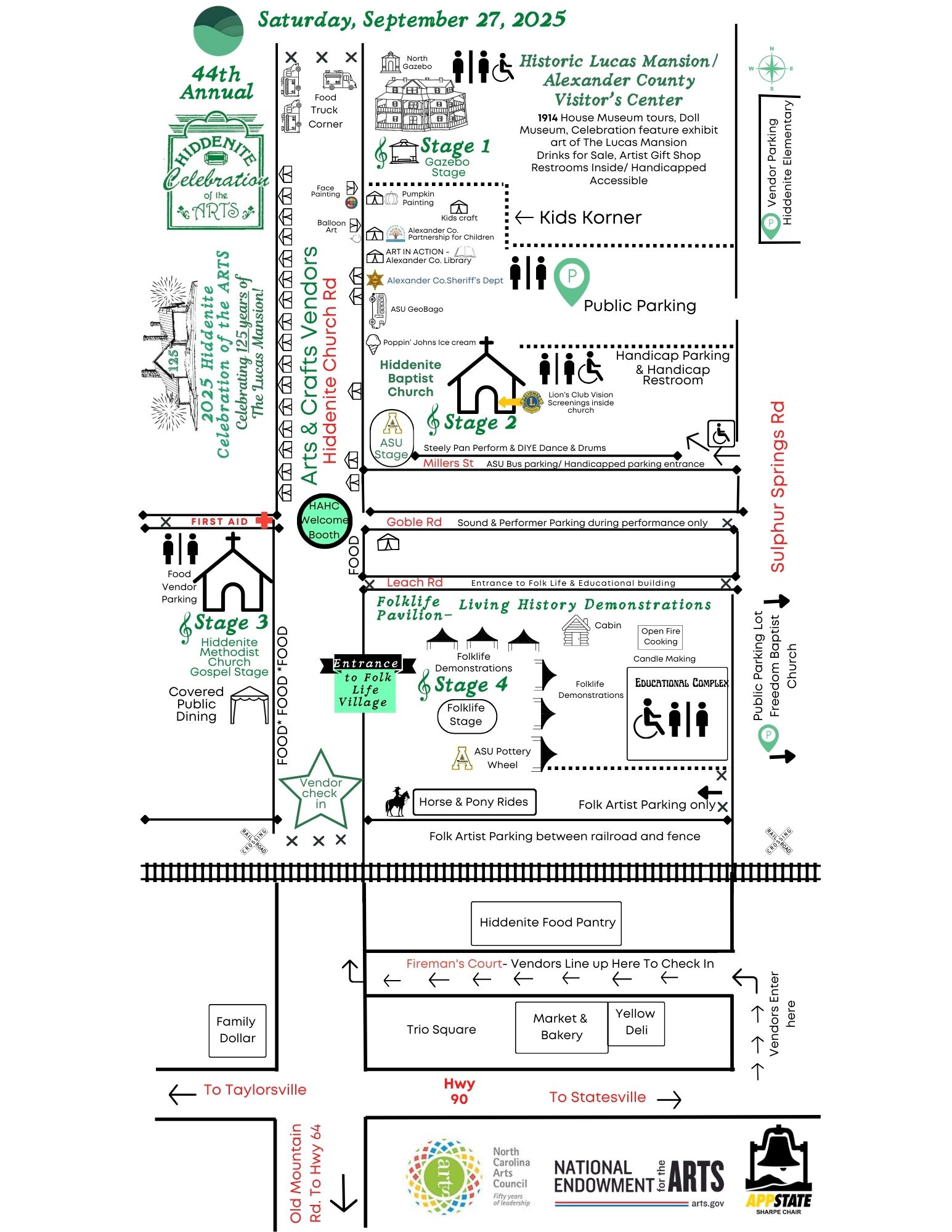 The Hiddenite Celebration of the Arts takes place each year on the fourth Saturday in September on Hiddenite Church Rd., in Hiddenite, NC. The FREE fest features shopping for fine arts and handmade products, living history demonstrations by skilled craftspeople, four live performance stages with music, dance, and storytelling, an interactive Celebration Children's area, and so much more! The Center’s Historic James Paul Lucas Mansion museum, art gallery, permanent collections, and the Alexander County Visitor Center (housed within the Lucas Mansion) will be open for visitors throughout the day. Museum tours will be available. All other Lucas Mansion exhibits are free and open to the public. We can't wait to meet you!