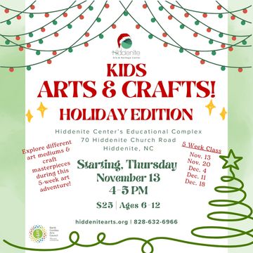 Celebrate the Holidays with After-School Arts & Crafts at the Hiddenite Arts & Heritage Center! The Hiddenite Arts & Heritage Center invites children in kindergarten through fifth grade to join us this November for a colorful and creative Holiday Arts & Crafts Adventure!